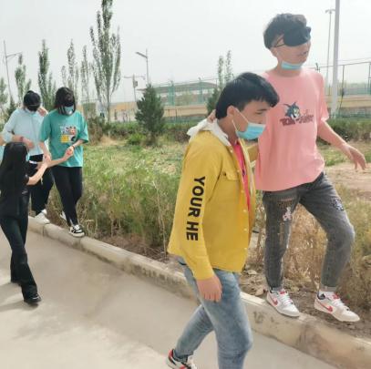 本次团体活动目的是为了促进团体成员间的互动,培养团体成员间信任感与责任心。此活动在所有任课老师的带领下,学生们两人一组,分别扮演“盲人”和“拐杖”,在不允许语言交流的前提下,相互扶持走完遍布障碍的长长“盲道”。