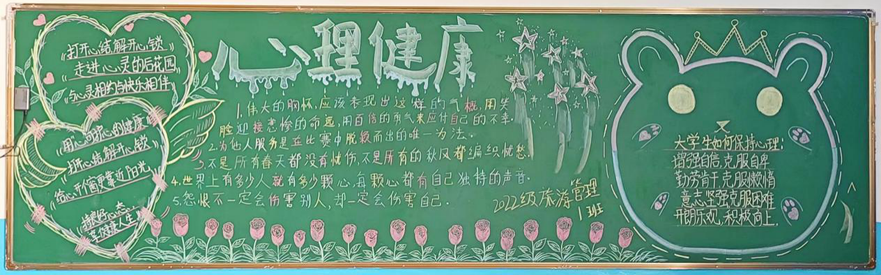 为认真做好关于开展2023年“5·25”心理健康教育系列活动通知的要求,进一步推进大学生的心理健康教育工作,普及大学生心理健康知识,提升学生心理健康素质,在全院范围内营造积极、和谐的心理文化氛围。引导大学生更好地体验生活中的酸甜苦辣、对亲人朋友等心存感恩,帮助广大学生认识到幸福其实并不遥远,它就在我们的身边,提高个人幸福感,塑造完美人格。我院借“5.25——我爱我”之际,开展了丰富多彩的以“阳光心态、护航成长”为主题的一系列心理健康教育知识培训、讲座、团体活动与手抄报、黑板报、征文比赛、知识竞赛等系列活动。