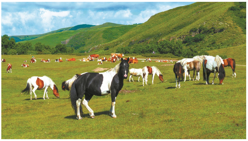 2025年8月10日,巴彦温都尔苏木塔林花国家自然公园的游牧场,成群的马、牛正在觅食。