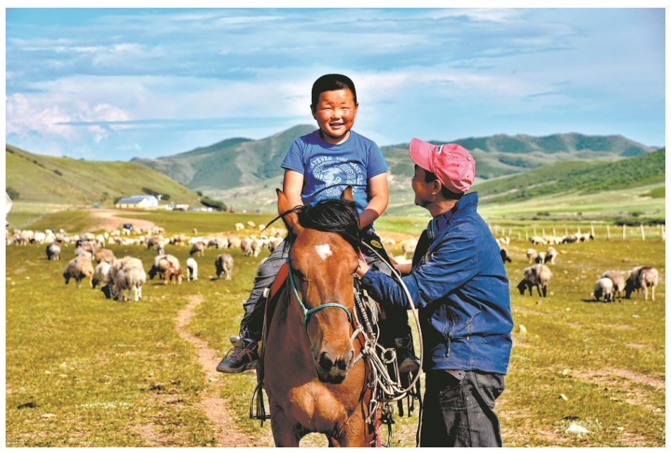2022年6月16日,阿鲁科尔沁旗巴彦温都尔苏木草原游牧区,牧民家的孩子正在学骑马。