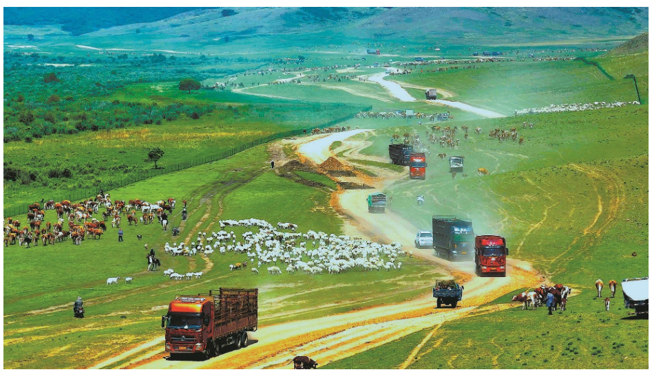 逶迤数十里,汽车、羊群、牛群、摩托车组成的队伍,浩浩荡荡地行进在内蒙古赤峰市阿鲁科尔沁旗巴彦温都尔草原游牧迁徙的路上。