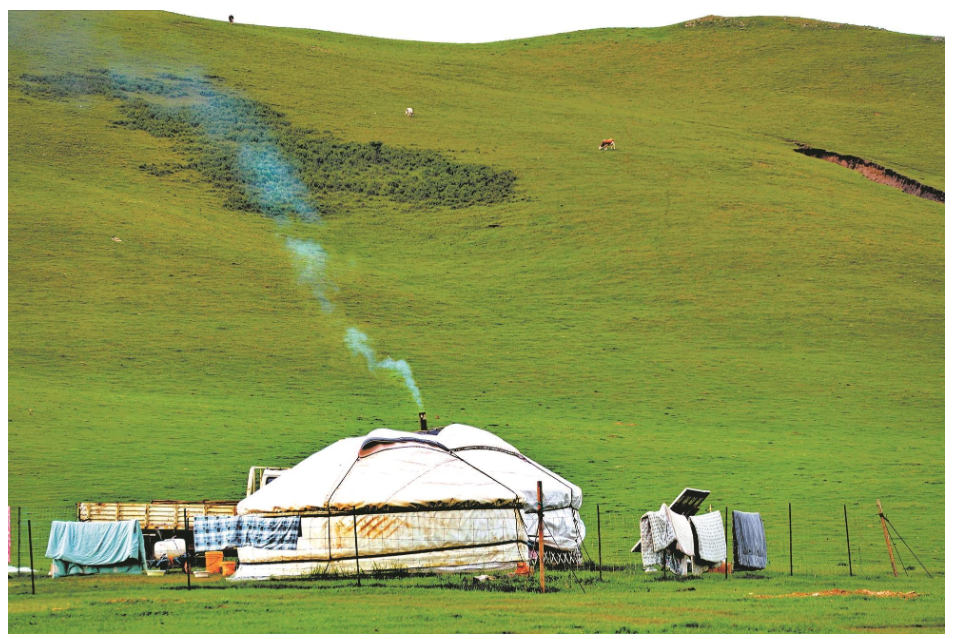 2023年8月4日,蒙古包中升起的炊烟,给绿色的草原增添了烟火气息。