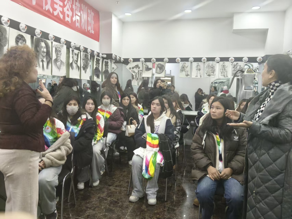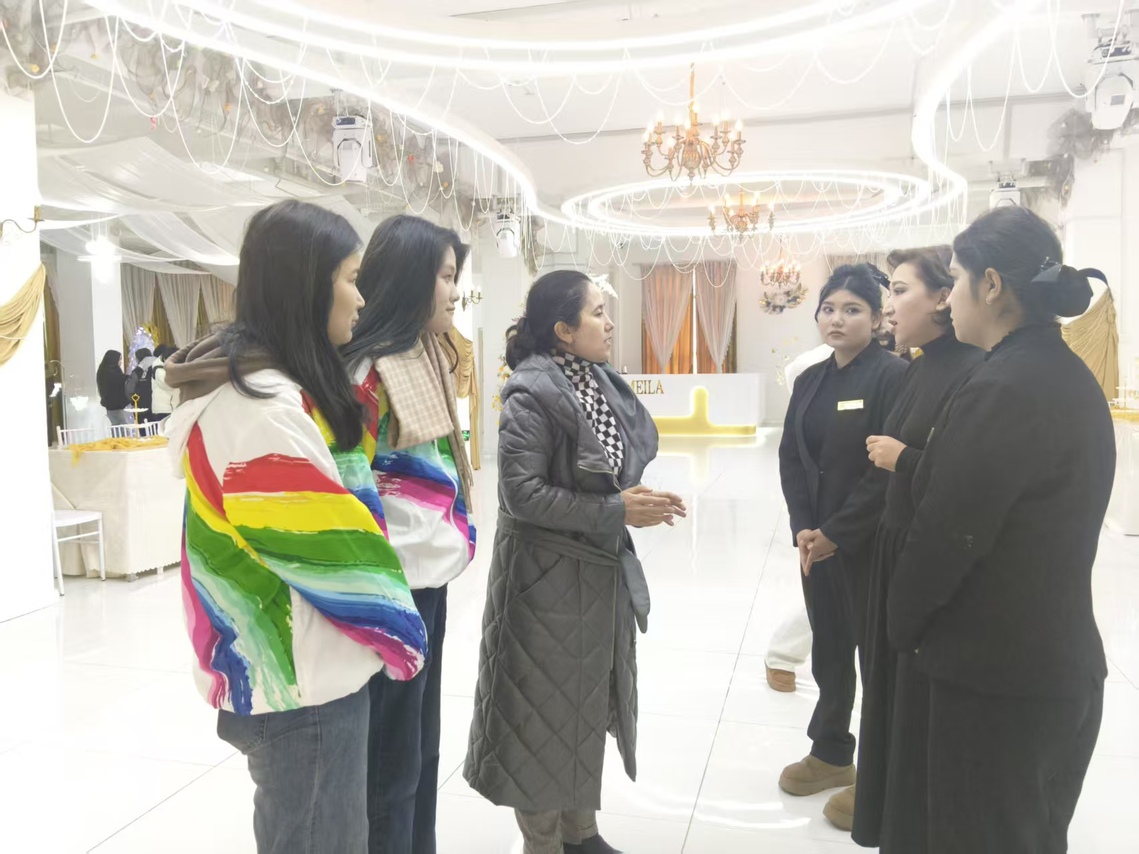 在交流分享会上,哈尼祖克拉·阿力木结合自身从校园学习到创业实践的历程,讲述了专业技能学习的要点与行业发展的趋势。面对学生们的专业作品,她从造型设计、技法运用、市场审美等维度逐一细致点评,指出作品的亮点与可改进之处,并现场示范实操技巧,让学生们直观感受到专业细节的重要性。分享会后,她还带领学生前往新疆叶色拉美容美发有限公司开展见习活动,实地参观门店运营、美发造型实操等工作场景,让学生近距离接触行业实际工作流程,加深对专业的理解与认知。